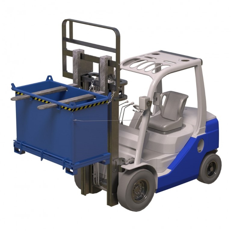 Dodatkowo kontener posiada łańcuch, który zabezpiecza go przed zsunięciem się z wideł wózka.