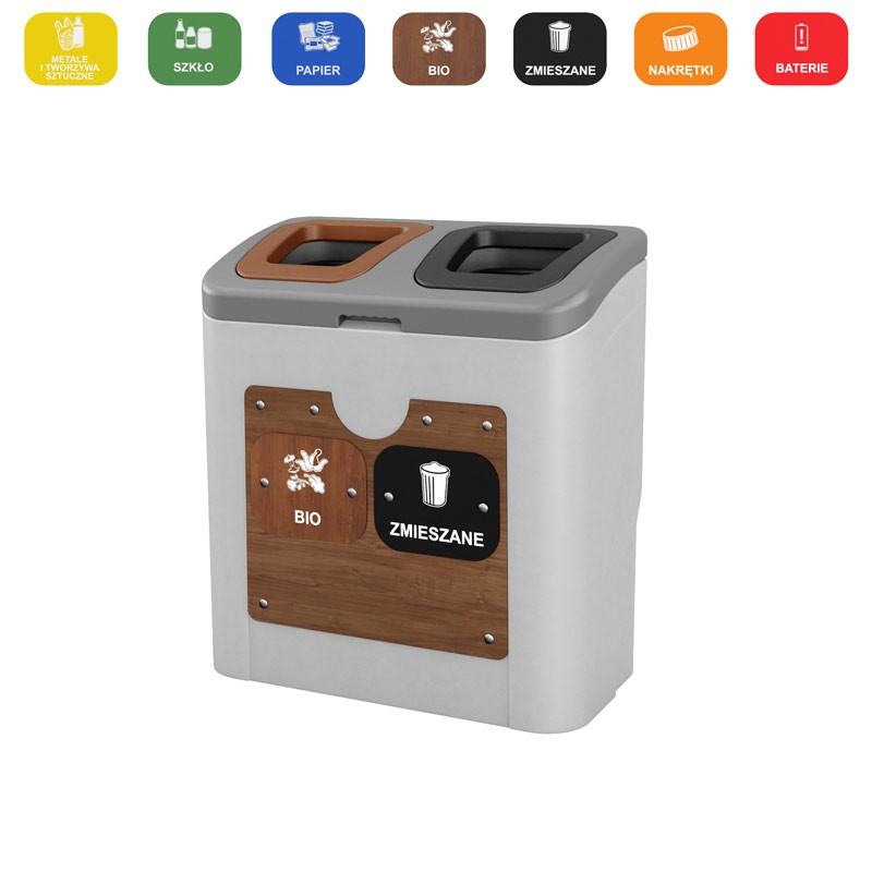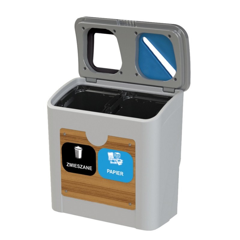 Elegancki kosz do sortowania odpadów SMART. Reprezentacyjny, nowoczesny i elegancki projekt nawiązujący przednim drewnopodobnym panelem do obecnych ekolicznych trendów determinuje zastosowanie kosza w firmach, instytucjach i innych przestrzeniach publicznych.