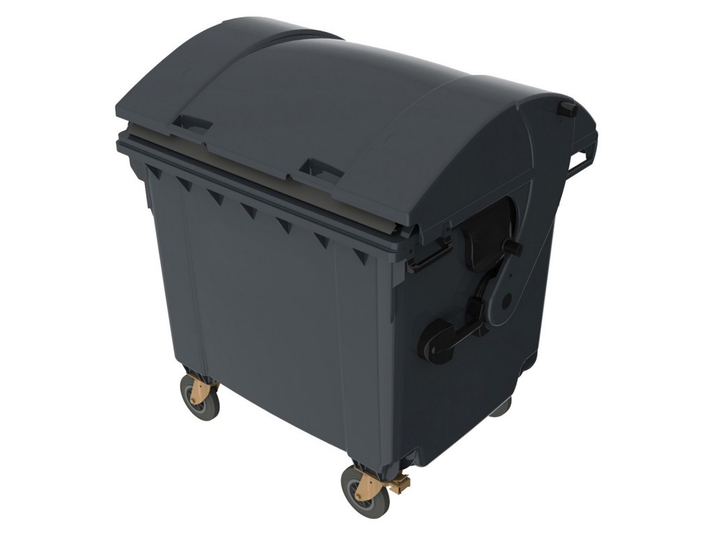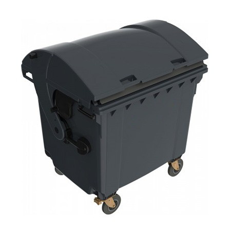 Plastikowy kontener 1100 l w kolorze czarnym (antracyt) przeznaczony jest na odpady komunalne. Pojemnik posiada przedni grzebień jak i boczne sworznie.